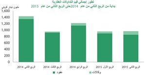 وعلى أساس سنوي سجلت التداولات العقارية بالعقود تراجعا بنسبة 36% وبمقدار 491 مليون دينار عن مستواها غير المسبوق الذي اقترب من نحو 1.4 مليار دينار خلال الربع الثاني 2015، بينما شهدت قيمة اجمالي التداولات العقارية بالوكالات ارتفاعا كبيرا على أساس سنوي وصلت نسبته 29% وبمقدار 25 مليون دينار مقارنة بنحو 86 مليون دينار كانت سجلت خلال الربع الثاني من العام الماضي.