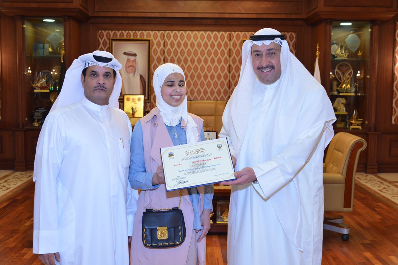كرم محافظ الفروانية الشيخ فيصل الحمود المالك الصباح الطالبة الكويتية جوري العازمي، لفوزها بالمركز الأول في مسابقة “تحدي القراءة” وتأهلها لتمثيل الكويت في المسابقة العربية المقررة في إمارة دبي سبتمبر المقبل.