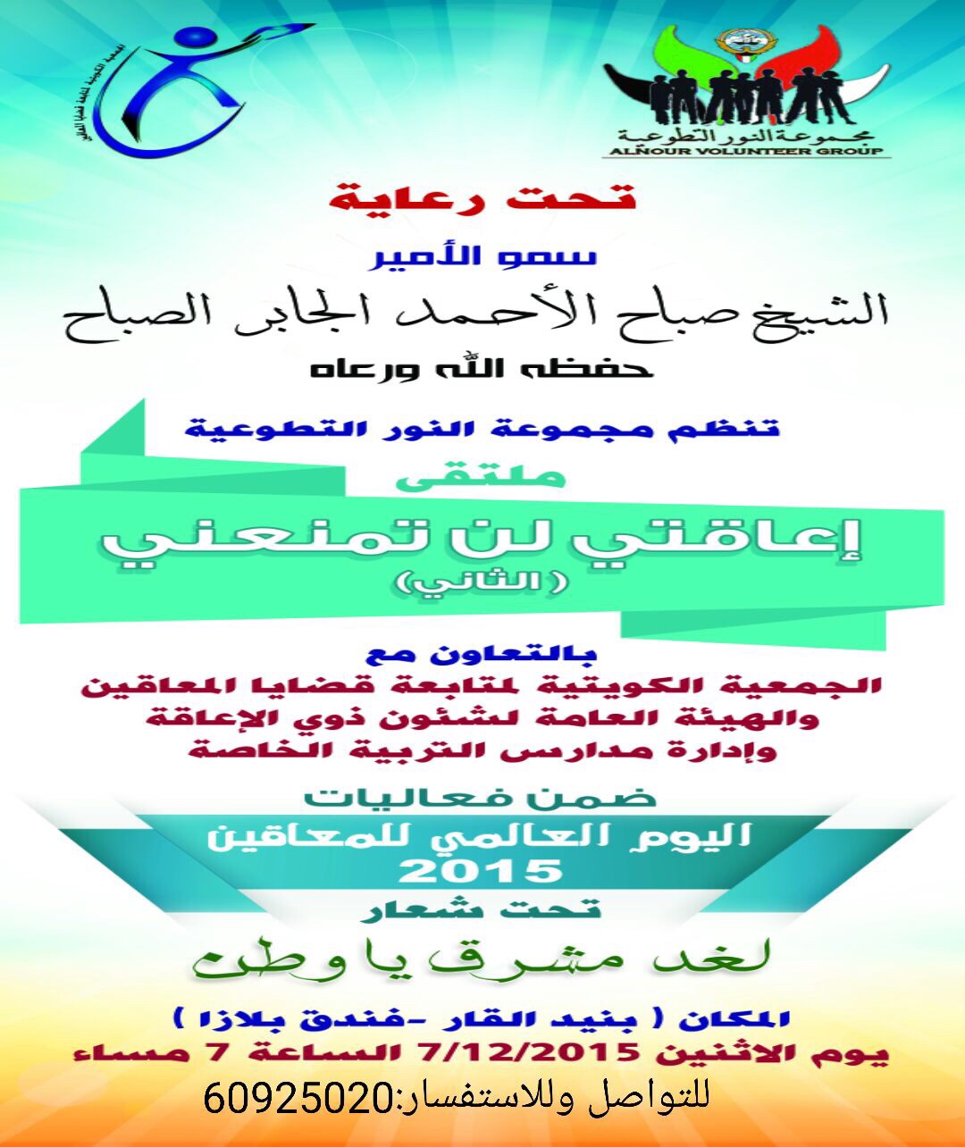 تحت رعايه سمو الأمير الشيخ صباح الأحمد الجابر الصباح حفظه الله ورعاه تنظم مجموعة النور التطوعية ملتقى إعاقتي لن تمنعني ( الثاني ) بالتعاون مع الجمعية الكويتية لمتابعة قضايا المعاقين والهيئة العامة لشؤون ذوي الإعاقة وإدارة مدارس التربية الخاصة ضمن فعاليات اليوم…